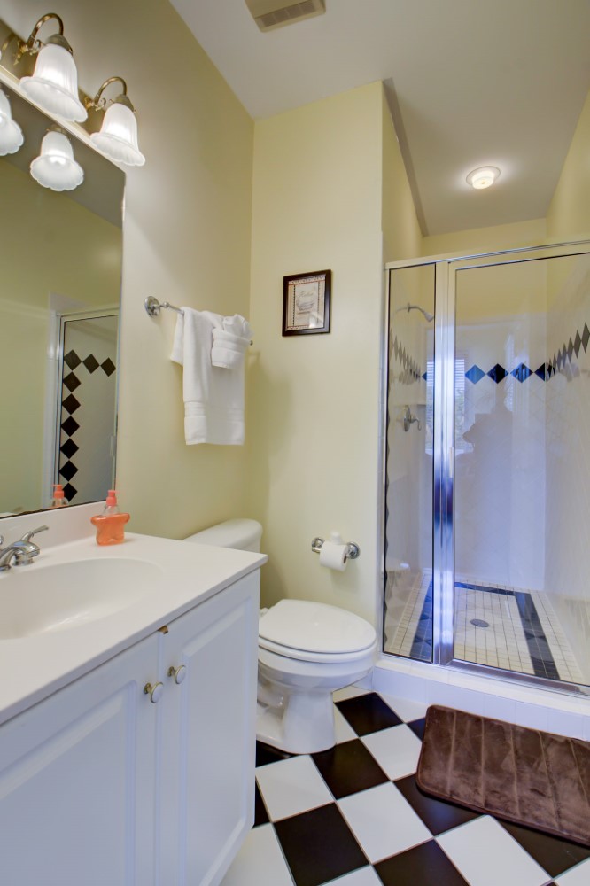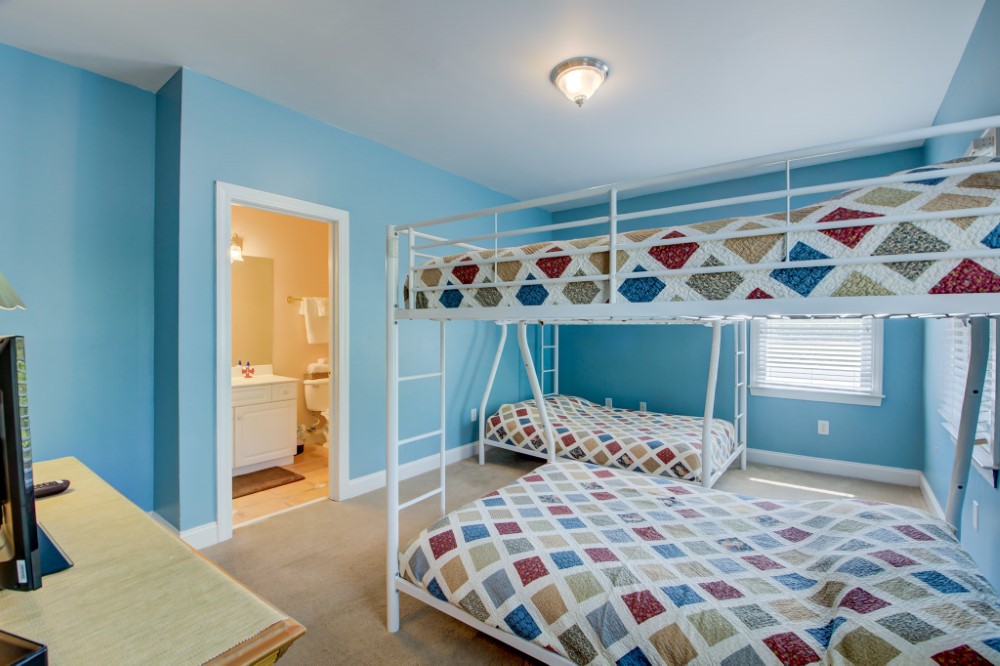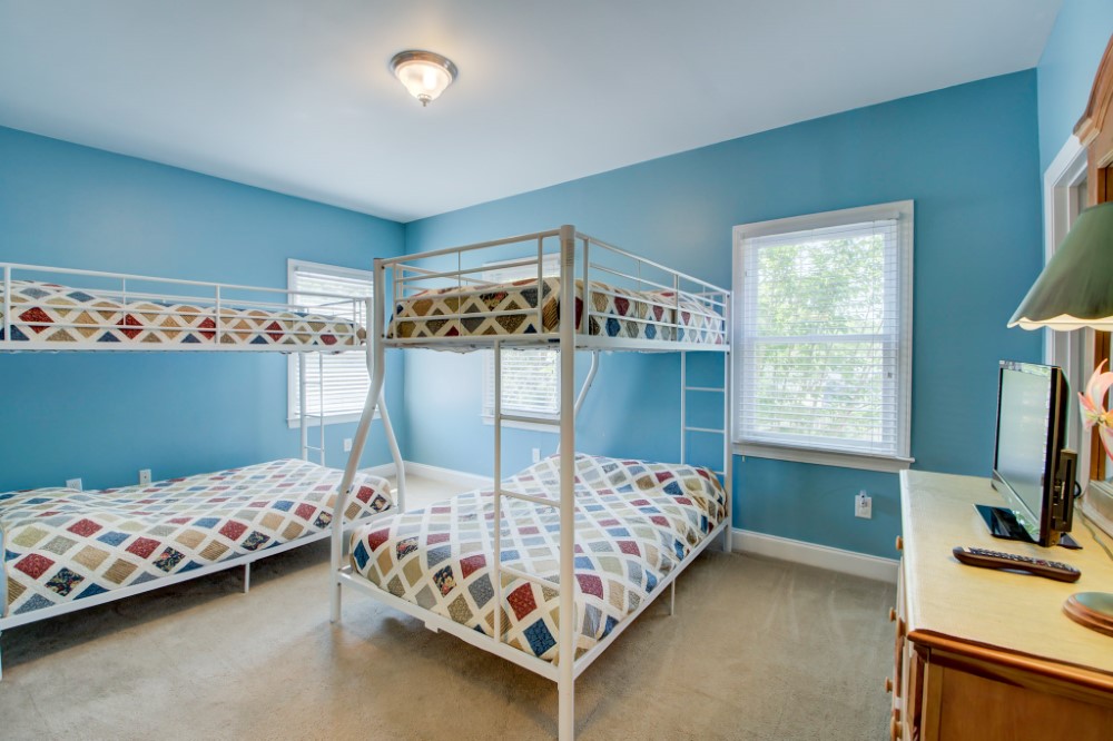 Upon entering the home’s from the front staircase you will find a den with gas fireplace and sitting area, this floor has 4 large bedrooms and 3.75 bathrooms. This floor has a king bedroom/private bath, one queen bedroom/private bathroom, and another queen bedroom shares a connecting 1.75 bathroom (two private toilets & sinks/shared shower) with the pyramid bunk room.
